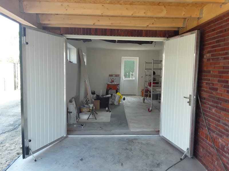Bent u op zoek naar openslaande deuren voor uw garage? Dan bent u bij Deuren Service Noord aan het juiste adres. Onze openslaande deuren zijn een mooie oplossing voor een garage waarbij u minder inbouw ruimte heeft. Daarnaast is het de ideale deur om gemakkelijk uw fiets op tuin materialen in of uit uw garage te halen.Openslaande deuren worden opgebouwd uit aluminium kokerprofielen met stalen sandwichpanelen van 40 mm PIR isolatie als vulling wat zorgt voor een hoge isolatiewaarde.